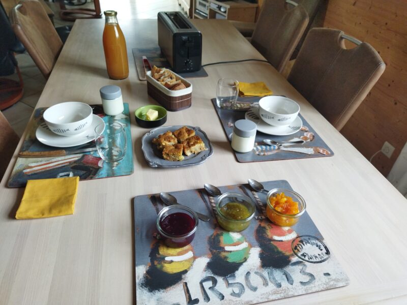 Zum Frühstück gibt es frisches Brot und hausgemachte Produkte (Joghurt, Marmelade, Kuchen).