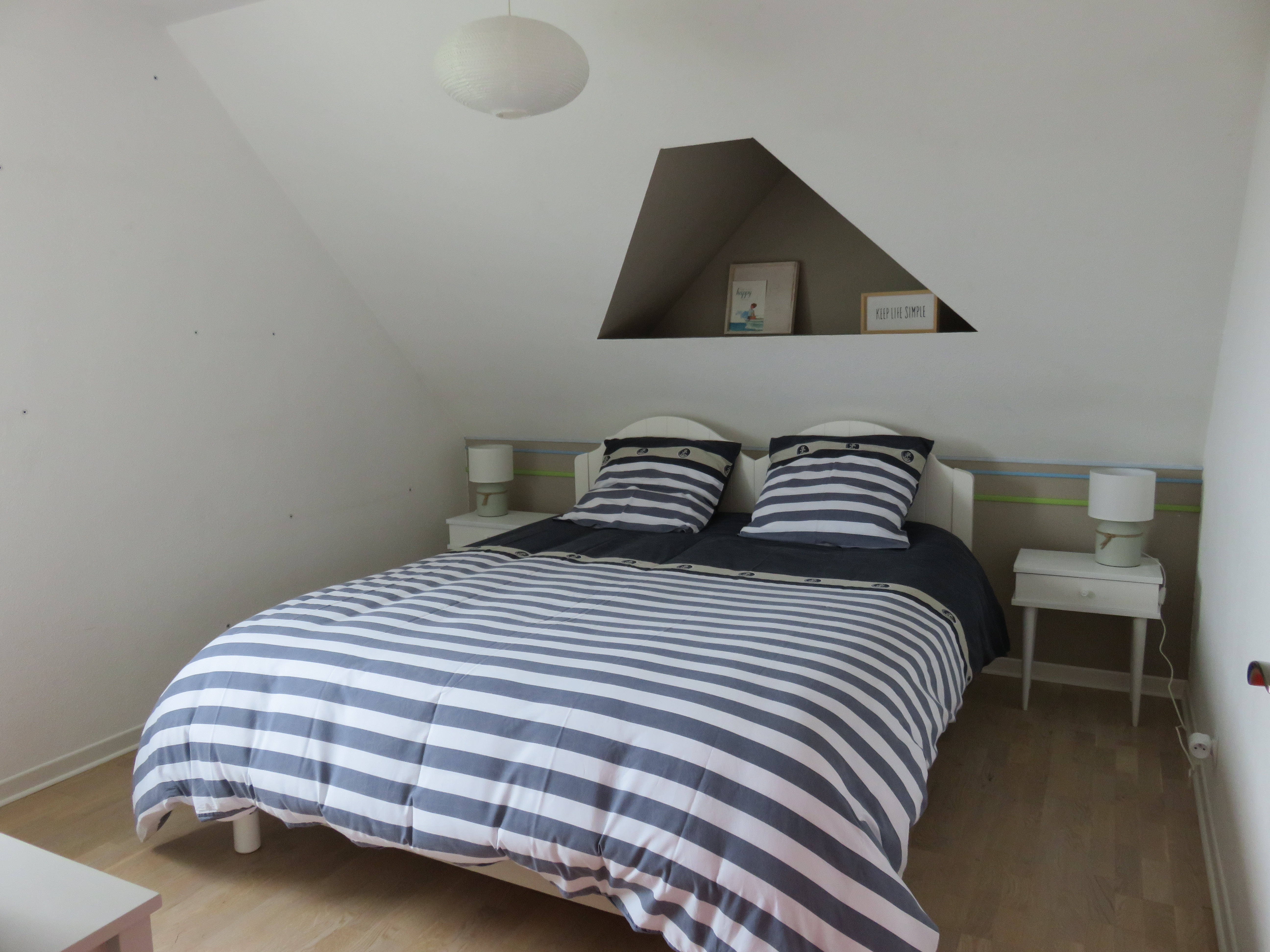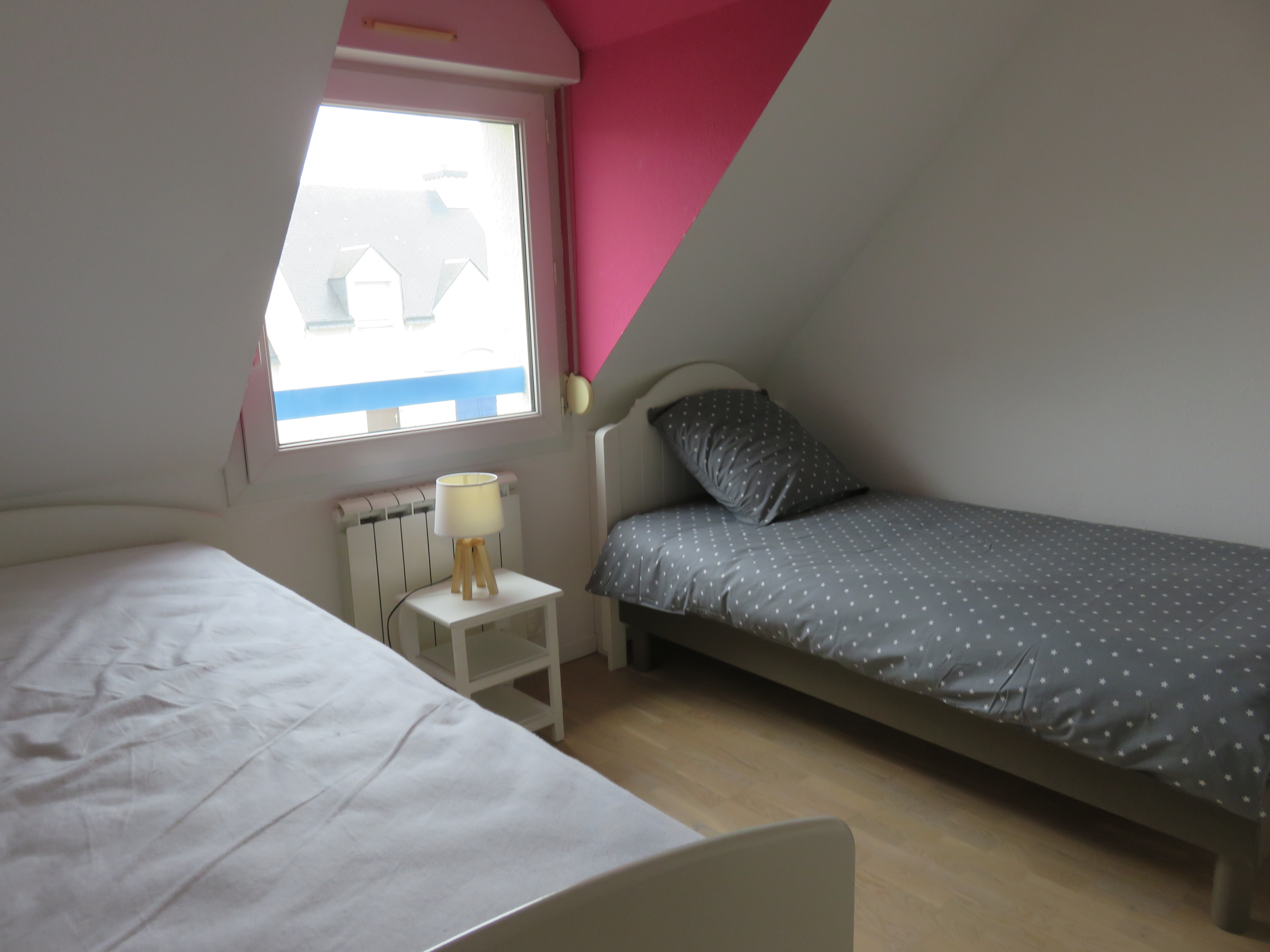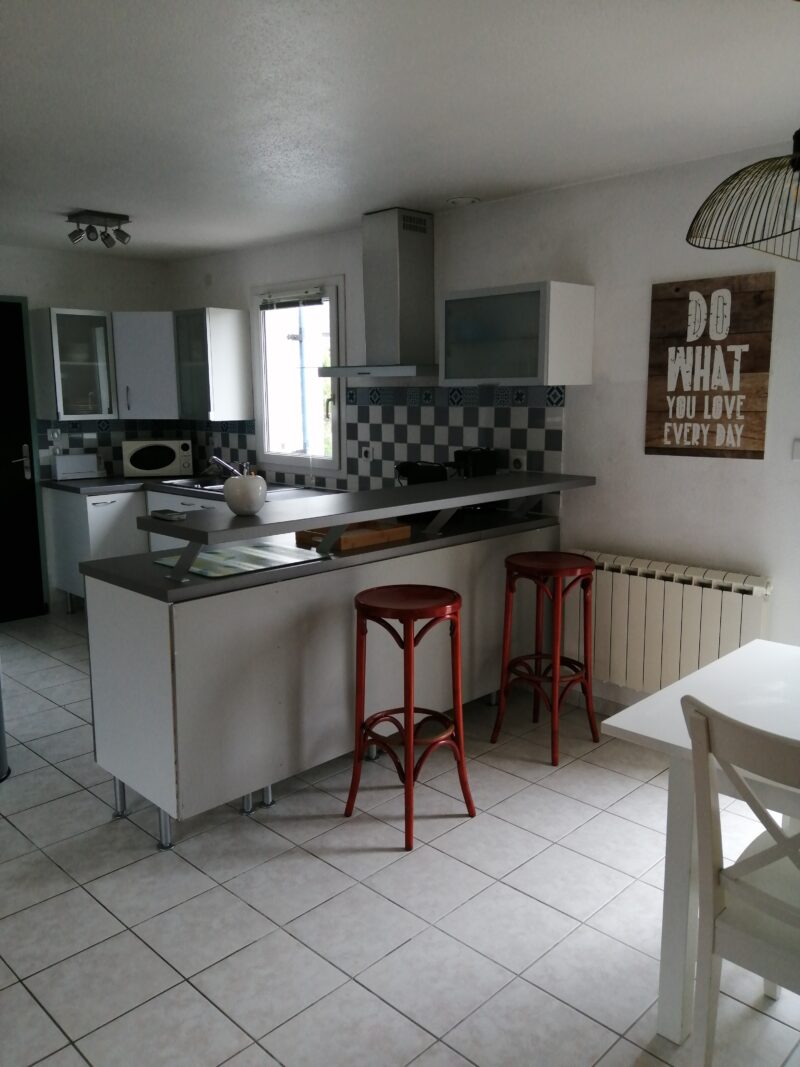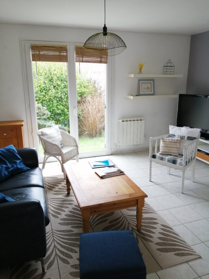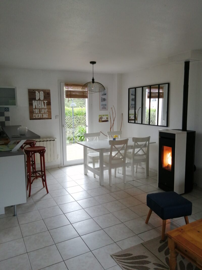 Ferienhaus mit Komforteinrichtungen, zwei Schlafzimmern und einem Garten, ideal für eine Familie mit zwei Kindern. Zwischengeschoss für die Kinder im Stockwerk. Babyausstattung.