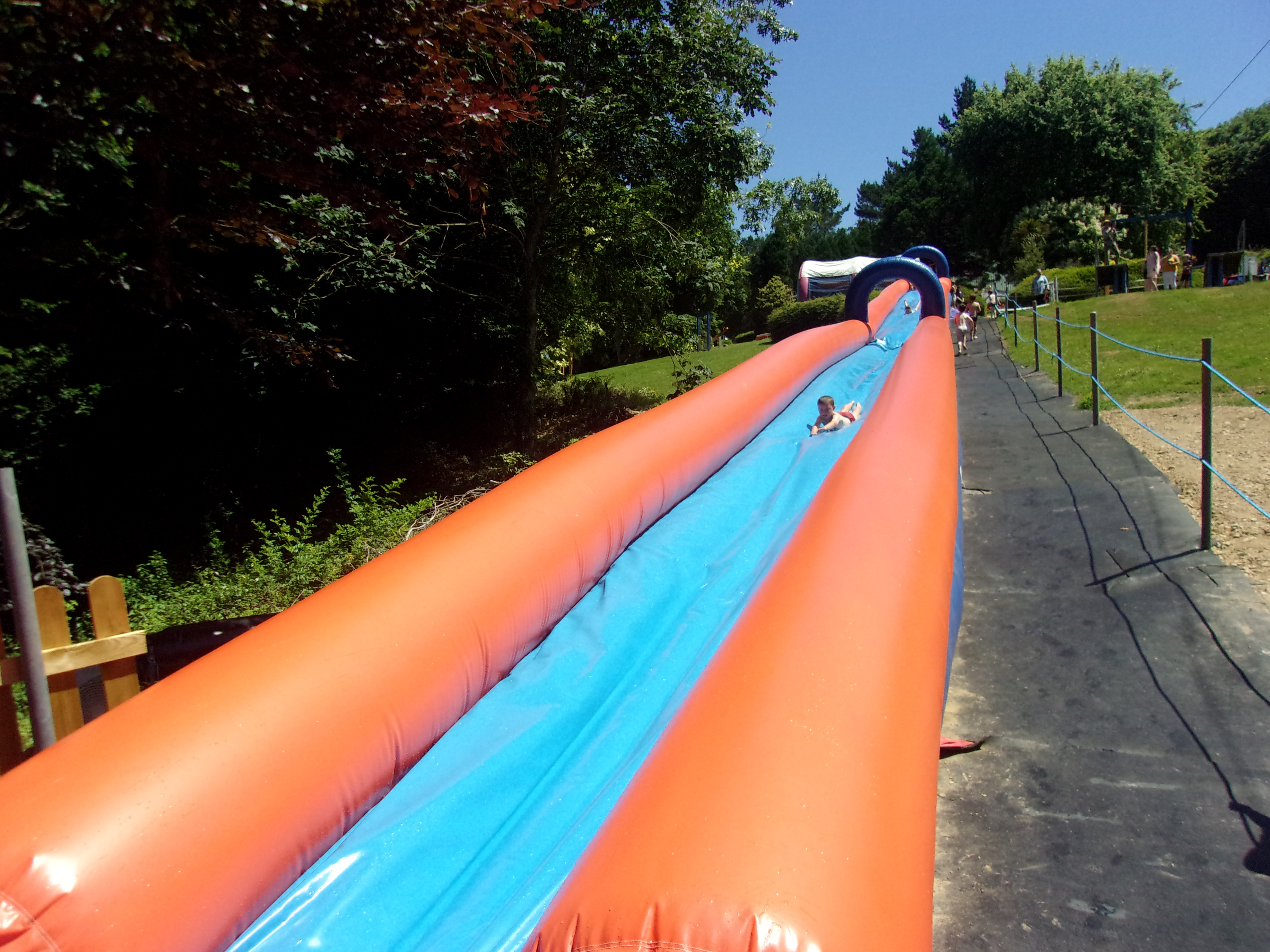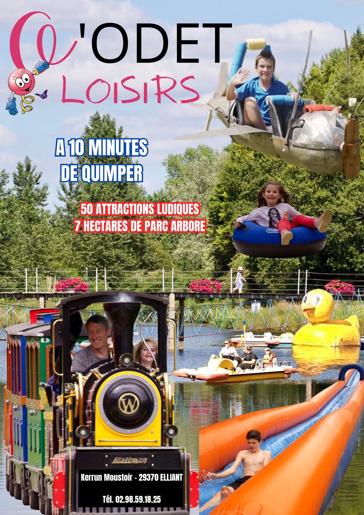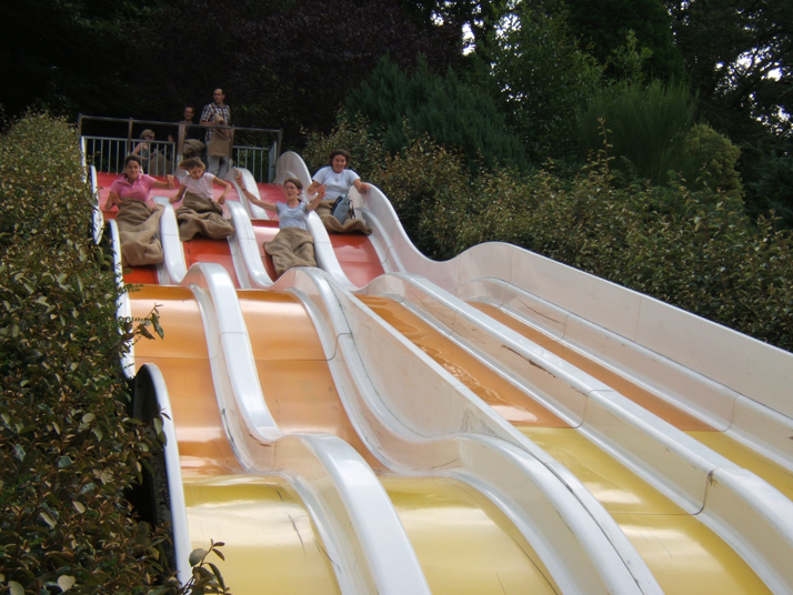 Dans un cadre vallonné et paysagé (7 ha) autour d’un plan d’eau. Gonflables, montagnes molles, trampolines, pont de singes, filets et cabanes dans les arbres, labyrinthe végétale (1 km), water-slide, pentagliss, ventri-gliss, petit train du far west, piste de tubing, toboggan, PARCABOUT…